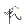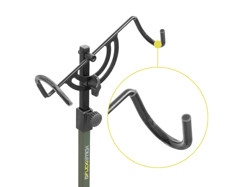 Vrchní část držící prut je vyformována z hrubého a pevného drátu černé barvy, který je specificky zahnutý tak, aby do něj bylo možné zasunout jakýkoli rybářský prut. Přední i zadní zahnutí je navíc potaženo gumou, což zamezí posouvání a zabrání poškození prutu. Držák je také polohovatelný pomocí kyvadlového mechanismu, takže si jej můžete nastavit do různých úhlů, ať už špičkou ke hladině, vodorovně nebo téměř kolmo vzhůru.